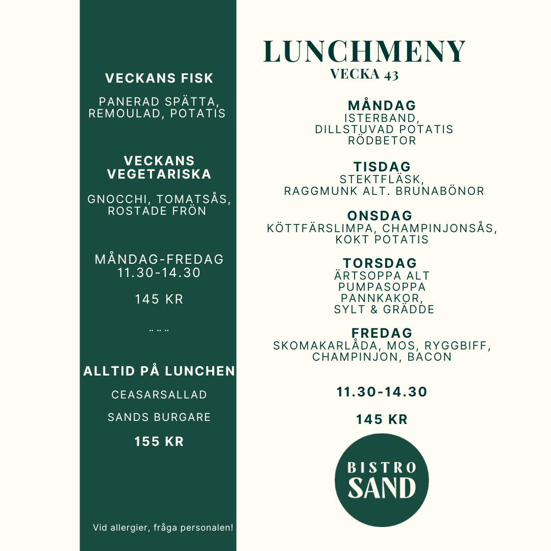På Bistro Sand får du en tidlös kulinarisk upplevelse där vi hyllar det klassiska matkonceptet. Vår meny är noggrant sammansatt för att erbjuda smaker av tradition och elegans. Njut av smakrika rätter som återspeglar rötterna i välkända recept, serverade med en modern twist och här är stämningen ett perfekt komplement till upplevelsen.