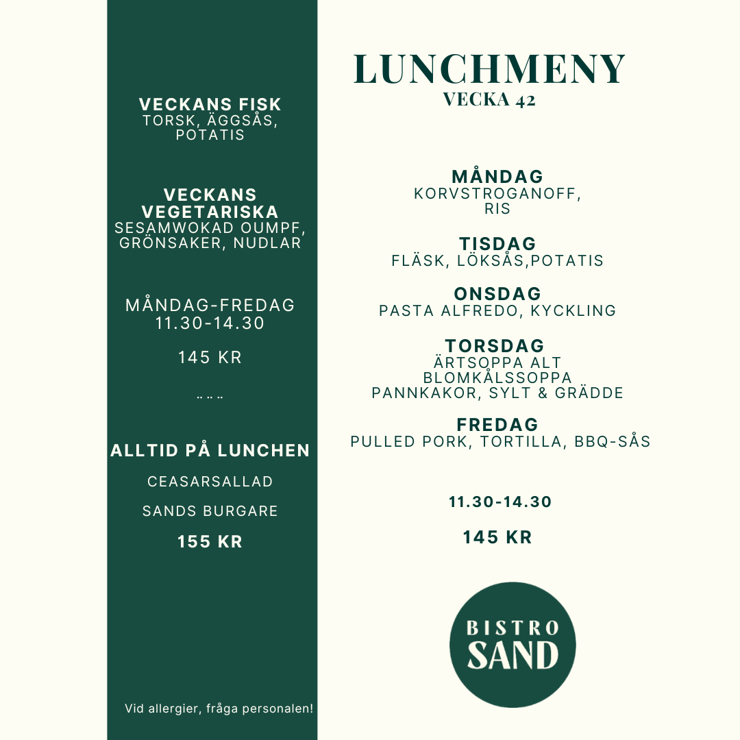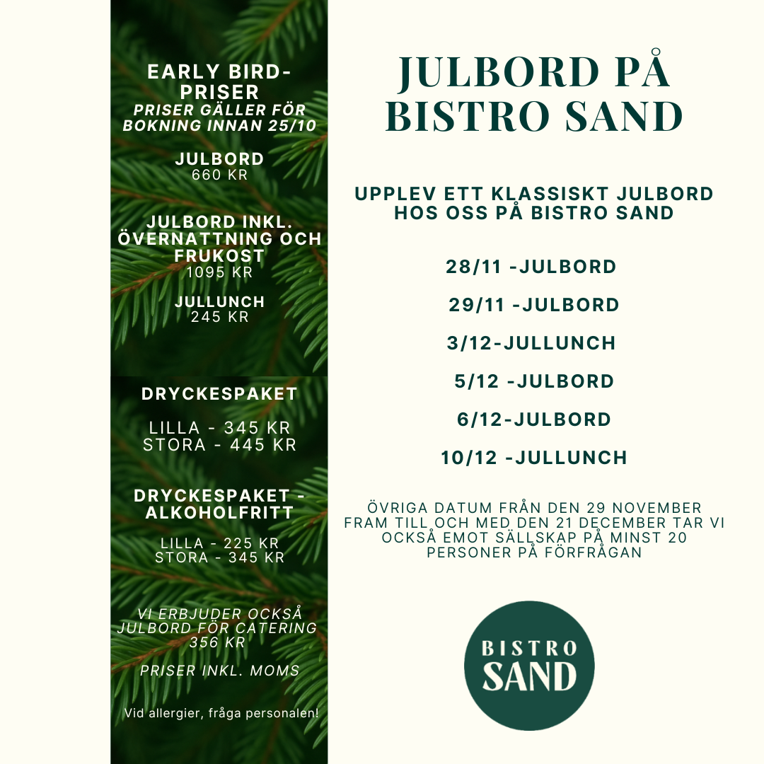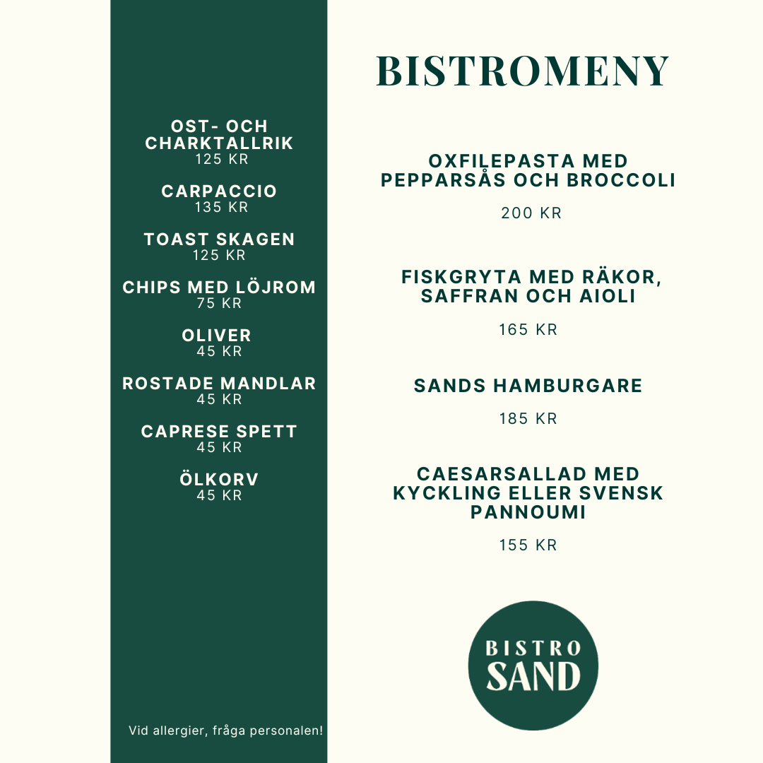 På Bistro Sand får du en tidlös kulinarisk upplevelse där vi hyllar det klassiska matkonceptet. Vår meny är noggrant sammansatt för att erbjuda smaker av tradition och elegans. Njut av smakrika rätter som återspeglar rötterna i välkända recept, serverade med en modern twist och här är stämningen ett perfekt komplement till upplevelsen.